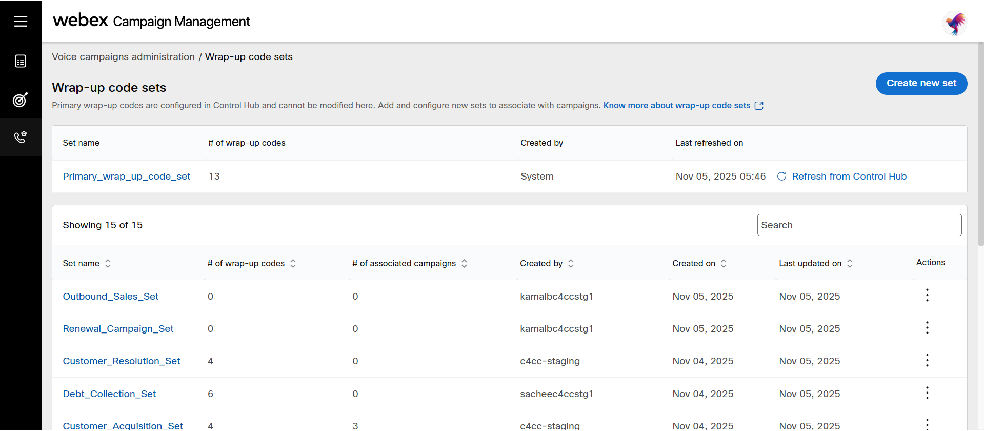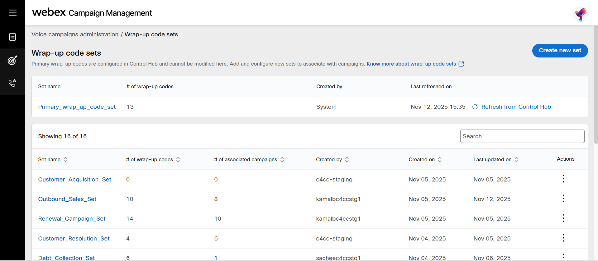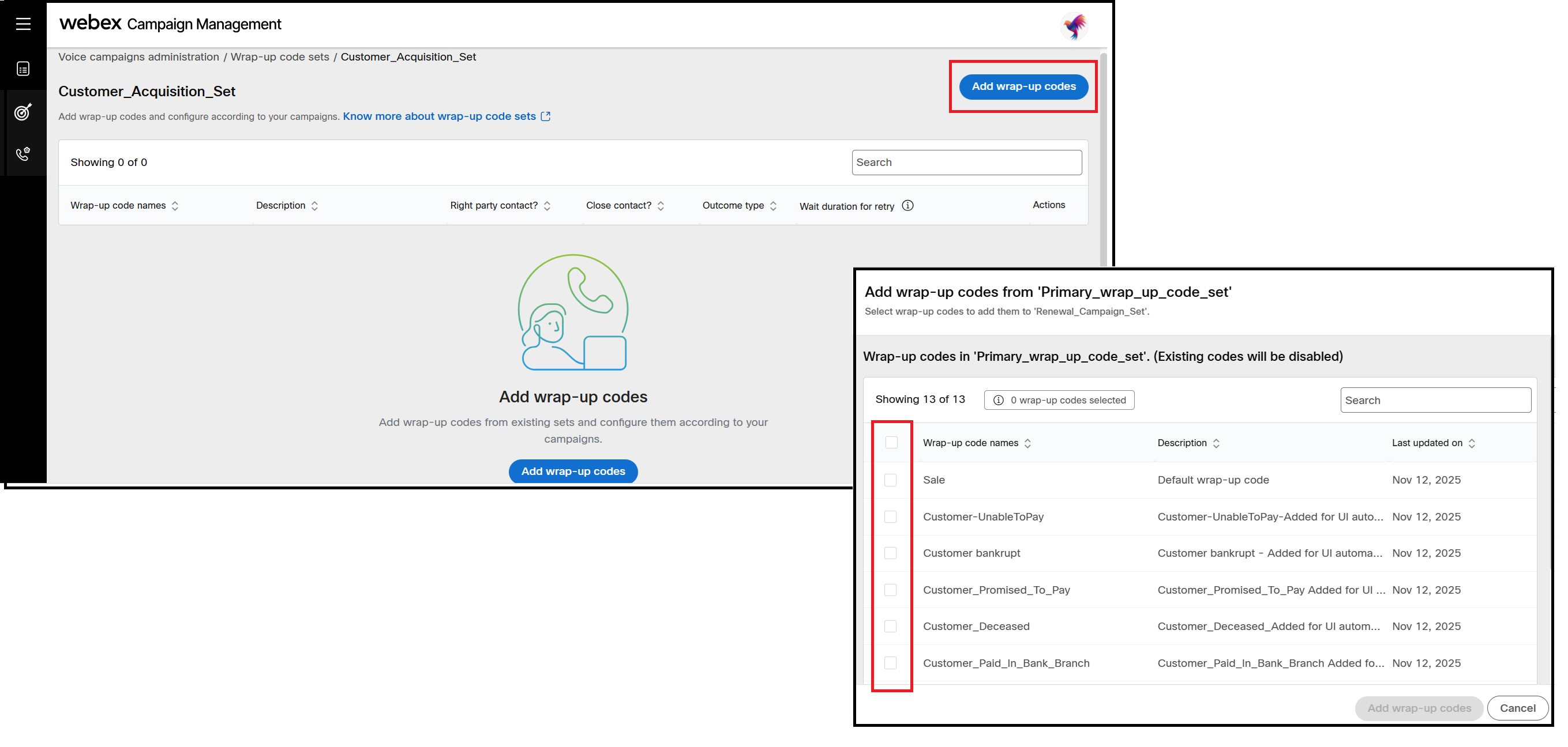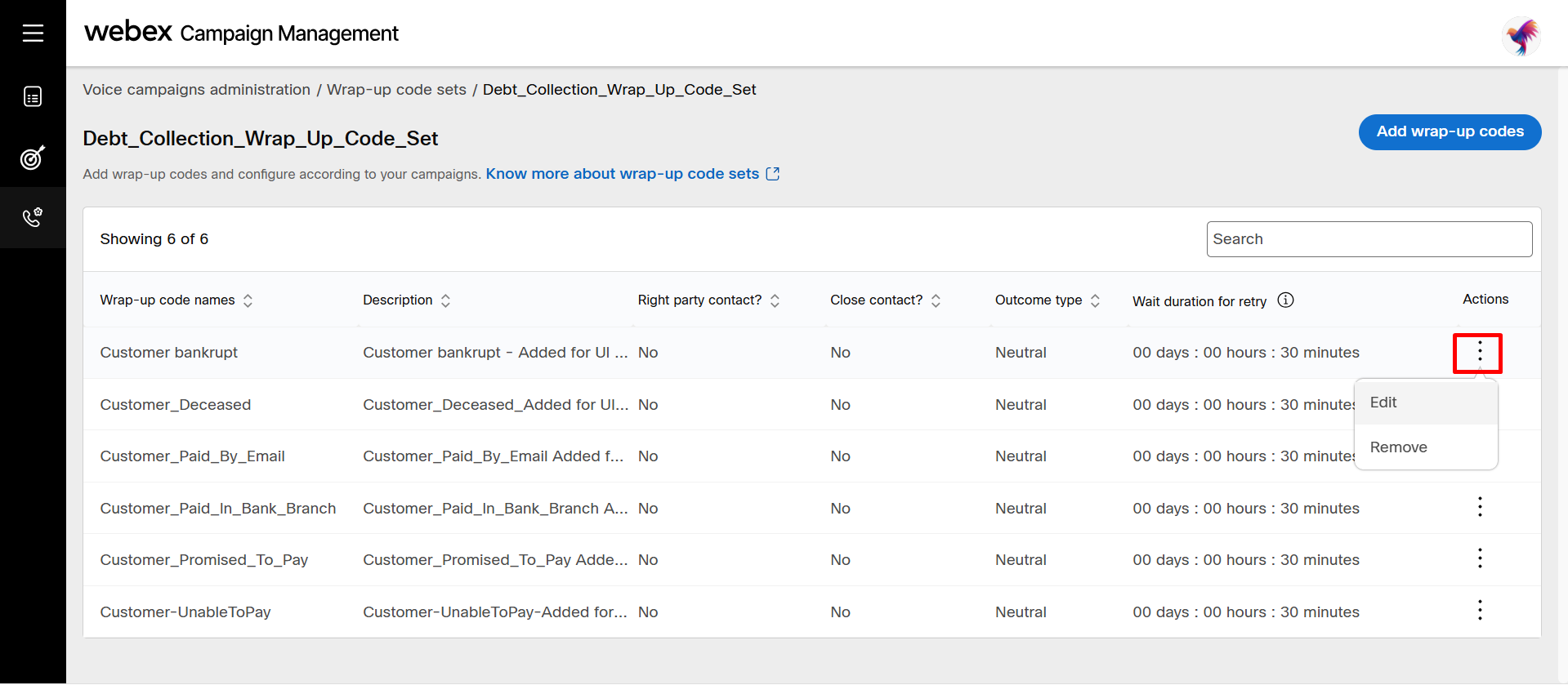 Wrap-up codes are the tags applied by agents after a call to categorize and record the outcome of each customer interaction. These codes are defined and managed in Control Hub. Although you can be periodically fetch and update them in Webex Campaign, new wrap-up codes cannot be created directly within Webex Campaign. However, you can edit the configuration of these wrap-up codes to determine whether a contact should be considered for future campaigns.