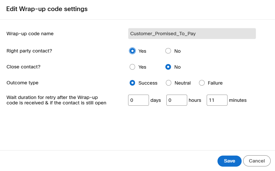 - Wait duration for the next call after the Wrap-up code is received & if the contact is still open: Configure the wait time before the next call attempt.