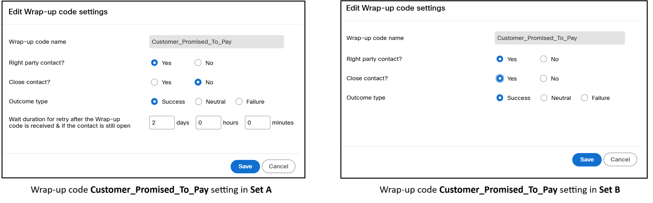 For example, the wrap-up code Customer_Promised_To_Pay in Set A can be configured with Close contact = Yes, while the same wrap-up code in Set B can be configured with Close contact = No.