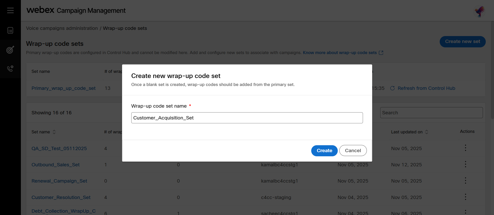 - Click Create new set and enter a name for wrap-up code set. For example, Customer_Acquisition_Set.