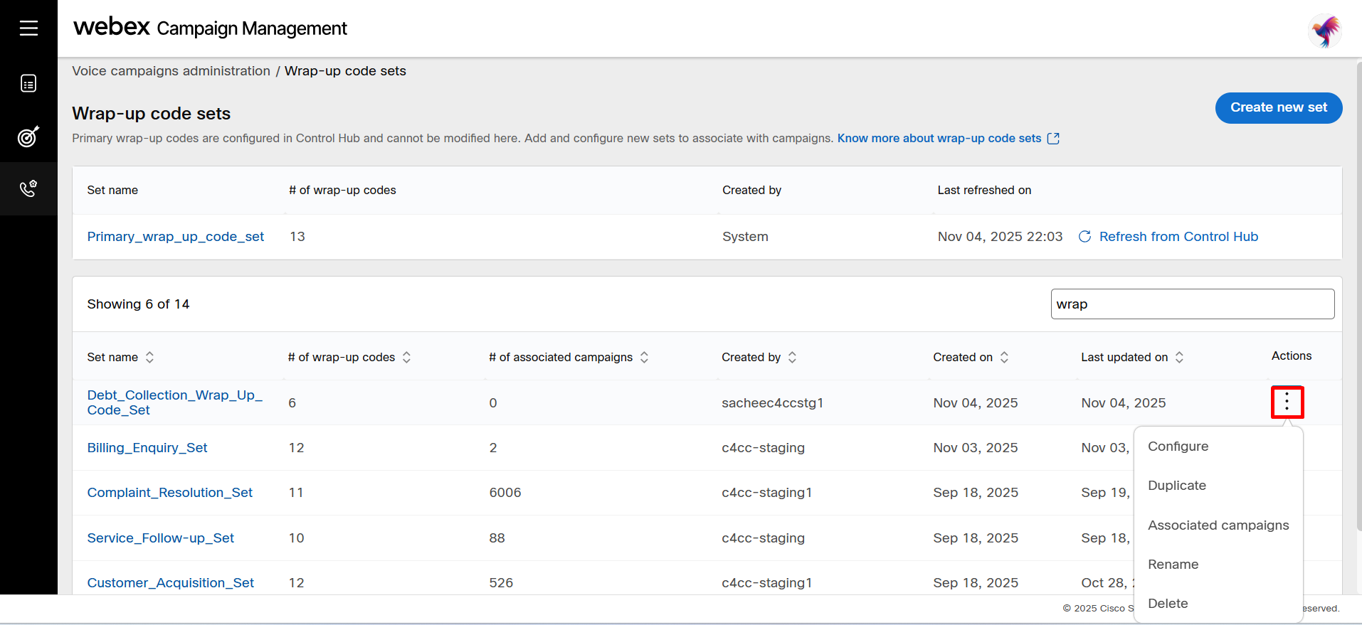 - To edit a wrap-up code set, click the ellipses icon of the required set and click Configure.
